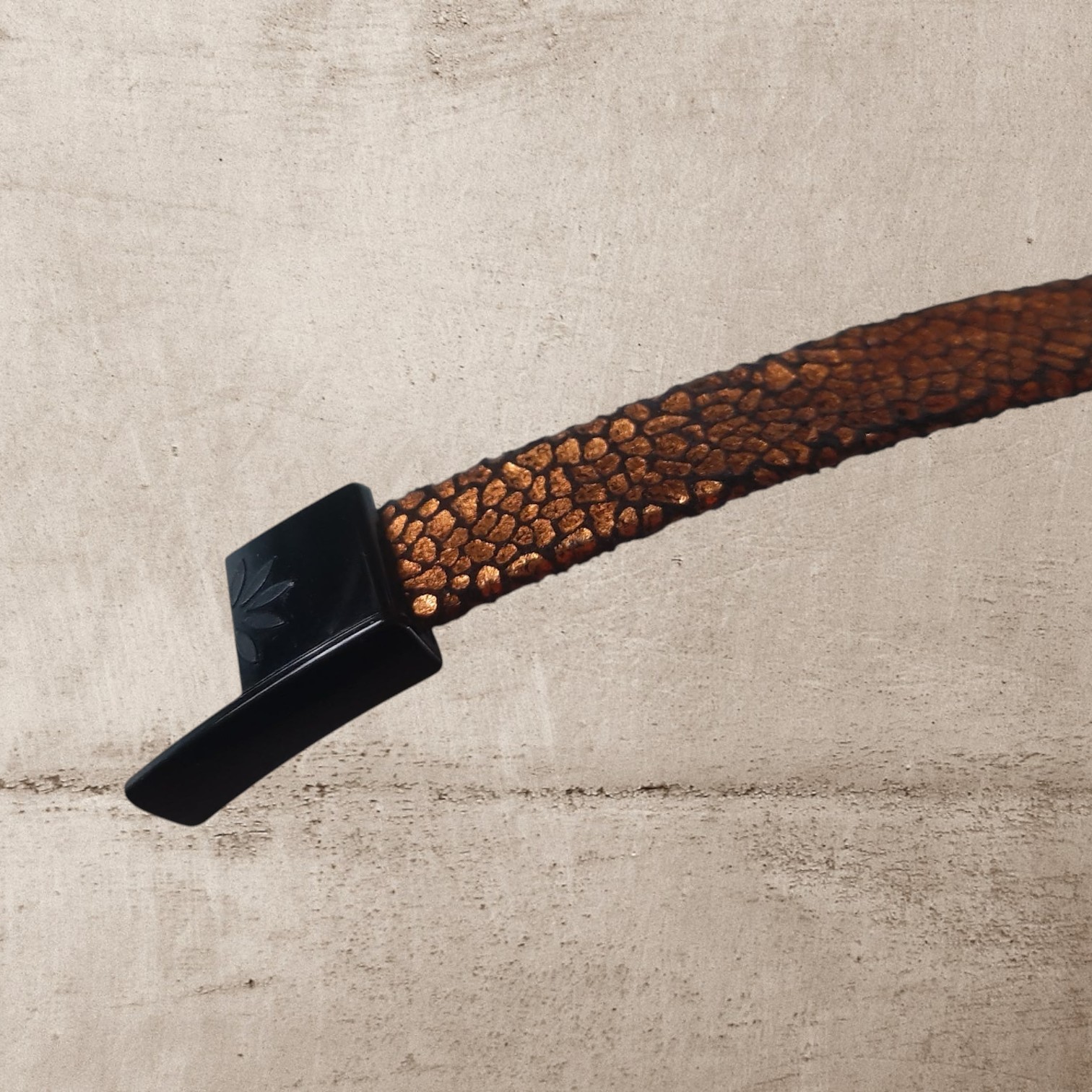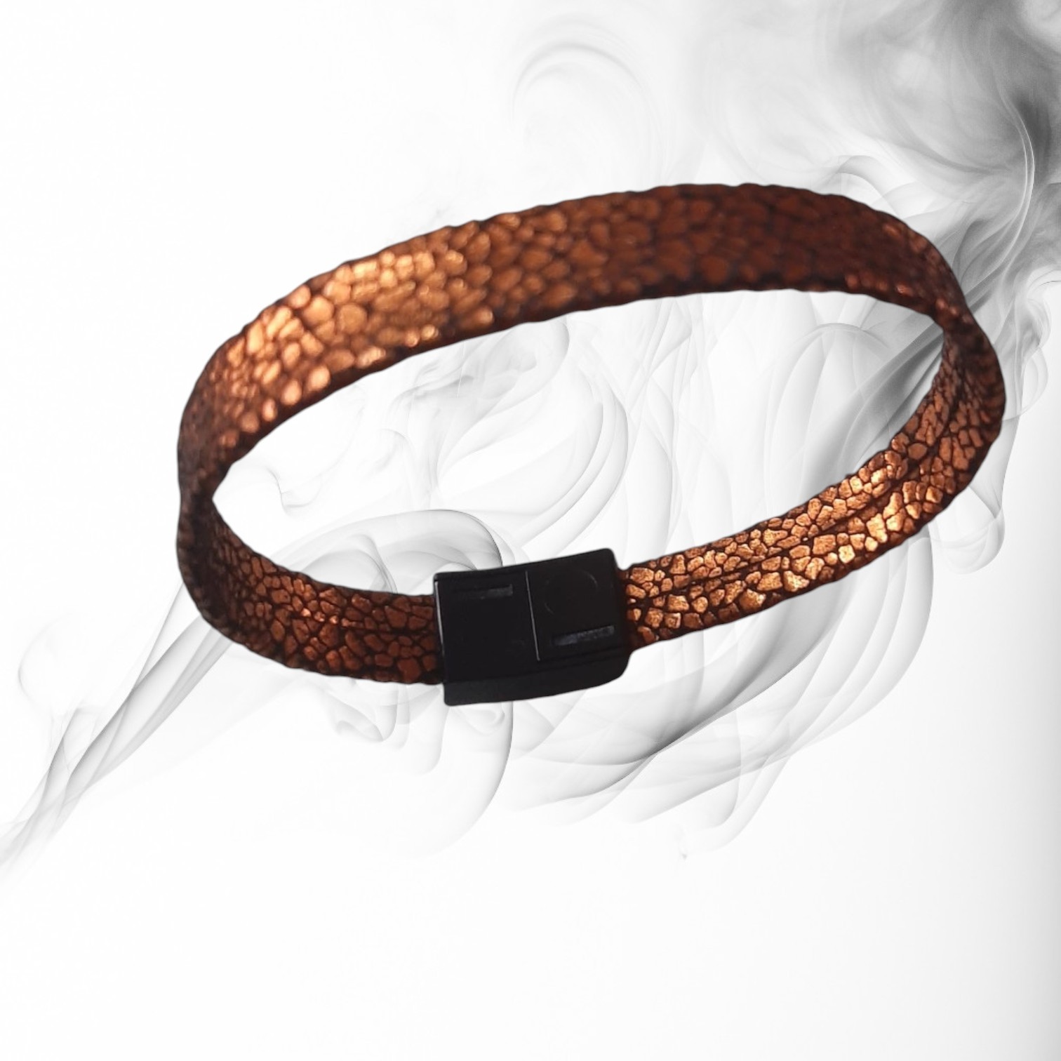 Le fermoir magnétique, discret et élégant, est camouflé à l'intérieur pour un rendu soigné. Léger et interchangeable, il est fabriqué en France par la société Hiilos en Haute-Savoie, avec des matériaux exempts de nickel, cadmium et plomb. Ce système breveté garantit confort et sécurité.