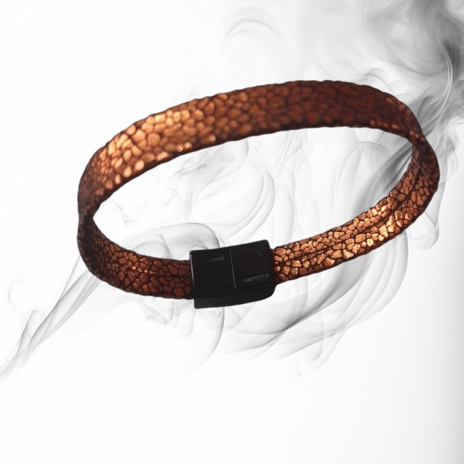 Le lien se glisse dans le fermoir, ce qui permet de posséder un bracelet manchette interchangeable et très facile à modifier. L'aimant est esthétiquement camouflé à l'intérieur du fermoir.