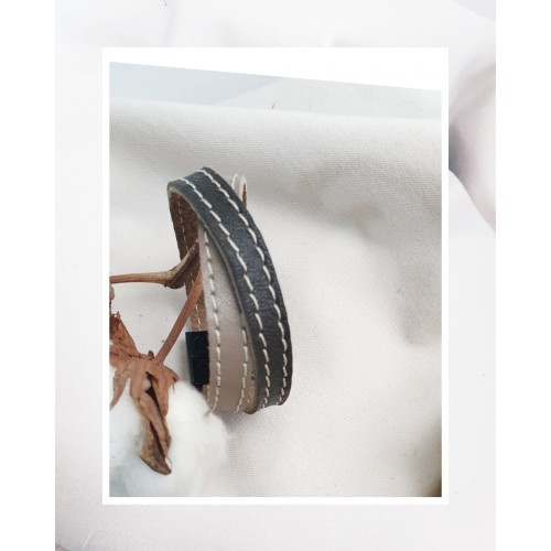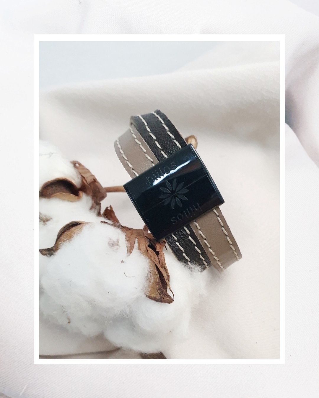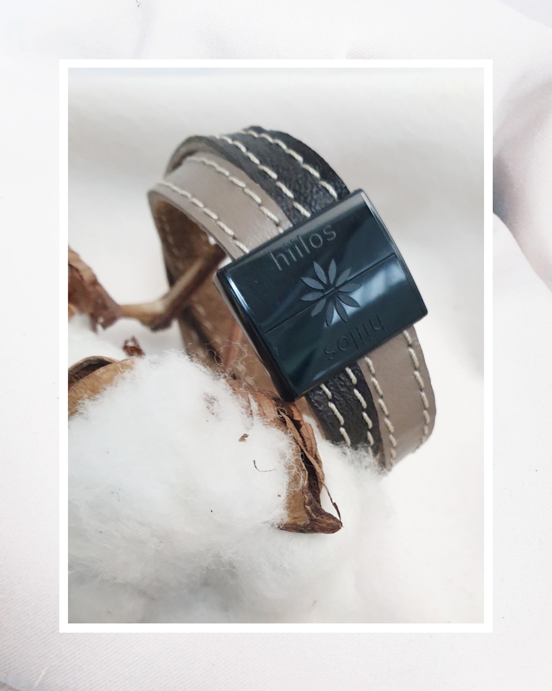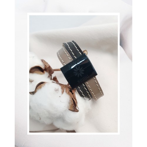 Ce bracelet PREMIUM 2.2 (2 cm) est monté sur une attache aimantée noire modulable de marque Hiilos. Les liens croisés sont en cuir marron et taupe doublés de porc. Un piquage écru révèle les couleurs du cuir.