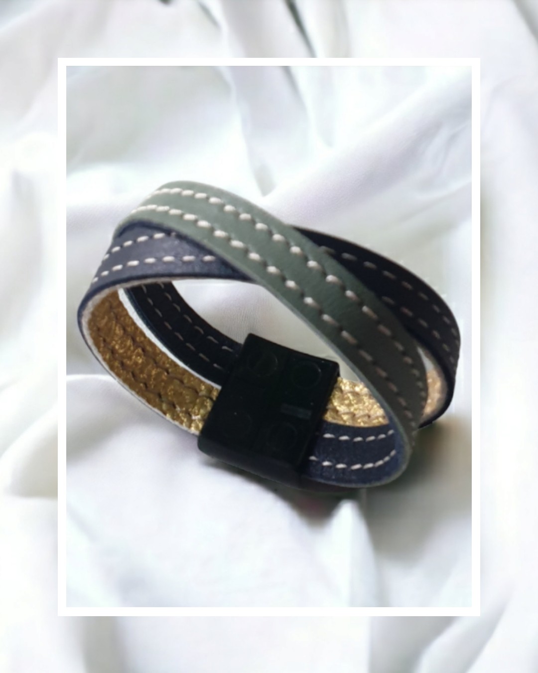 Ce bracelet PREMIUM 2.2 (2 cm) est monté sur une attache aimantée noire modulable de marque Hiilos. Les liens croisés sont en cuir doublés. Un piquage écru révèle les couleurs du cuir.